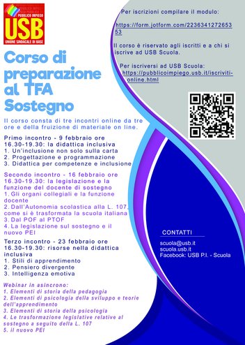 Anche quest’anno USB organizza un corso di formazione per la selezione di accesso al TFA per il sostegno (VIII ciclo).