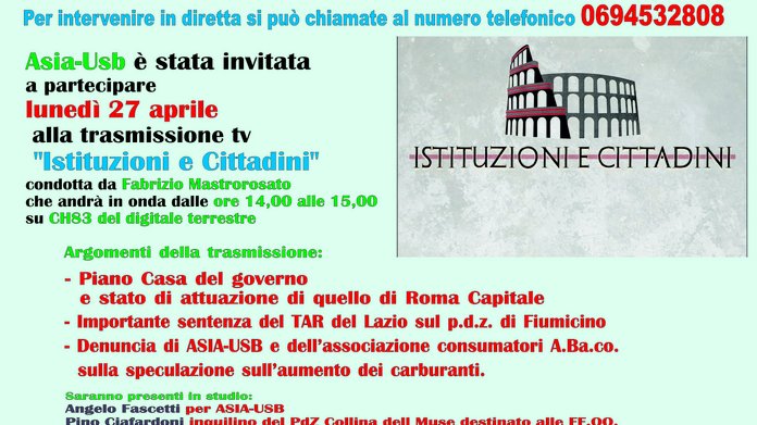 Lunedì 27 aprile dalle ore 14.00 su TeleRoma2 (CH83) dibattito sul tema dell'emergenza abitativa e sulla denuncia di ASIA-USB e di A.ba.co.…